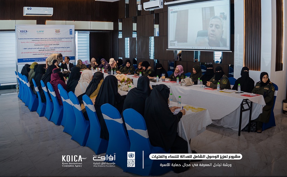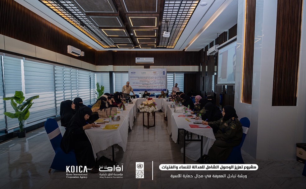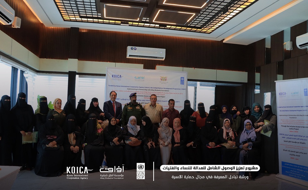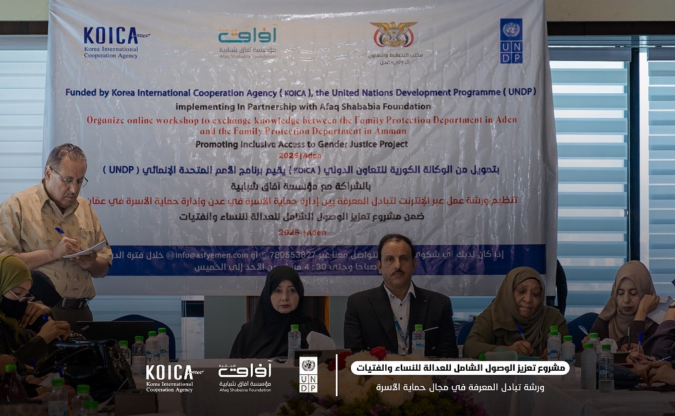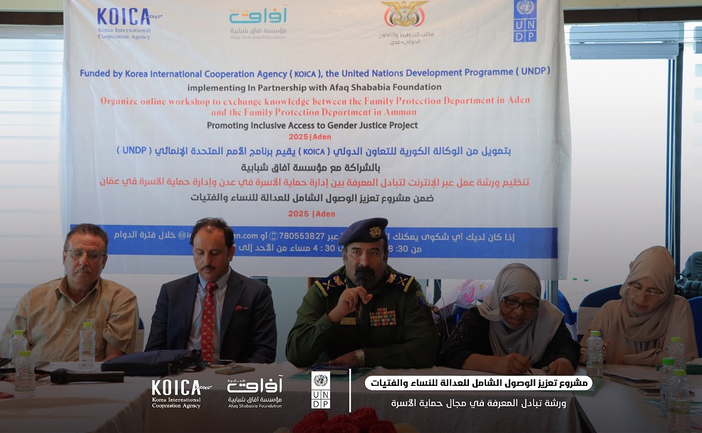 انطلقت في العاصمة المؤقتة عدن، خلال يومي 22 و23 سبتمبر 2025م،بتنسيق وإشراف وزارة الداخلية في العاصمة المؤقتة عدن أعمال ورشة تبادل المعرفة في مجال حماية الأسرة بين إدارة حماية الأسرة في وزارة الداخلية في العاصمة المؤقتة عدن وإدارة حماية الأسرة في المملكة الأردنية الهاشمية، ضمن الأنشطة التي يدعمها مشروع تعزيز الوصول إلى العدالة للنساء والفتيات، الذي ينفذه برنامج الأمم المتحدة الإنمائي (UNDP) بالشراكة مع مؤسسة آفاق شبابية (ASF)، وبدعم من الوكالة الكورية للتعاون الدولي (KOICA).